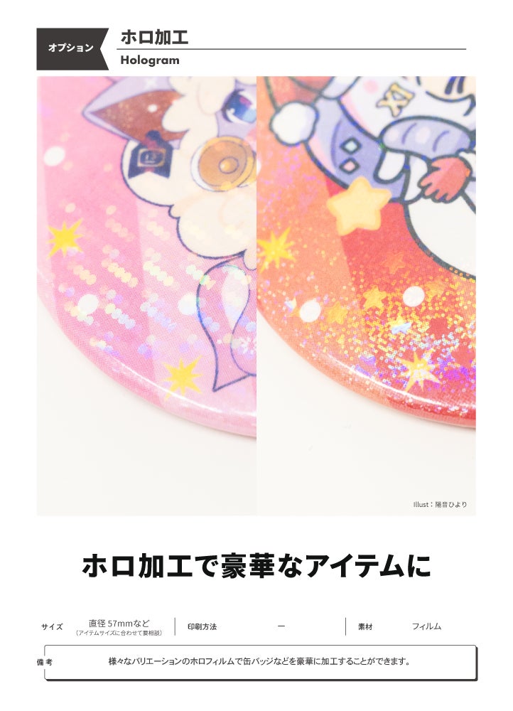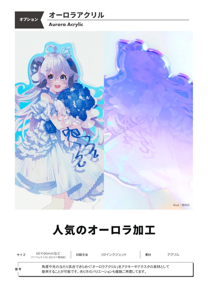オプションには人気の『オーロラアクリル』や缶バッチの『ホロ加工』があります。