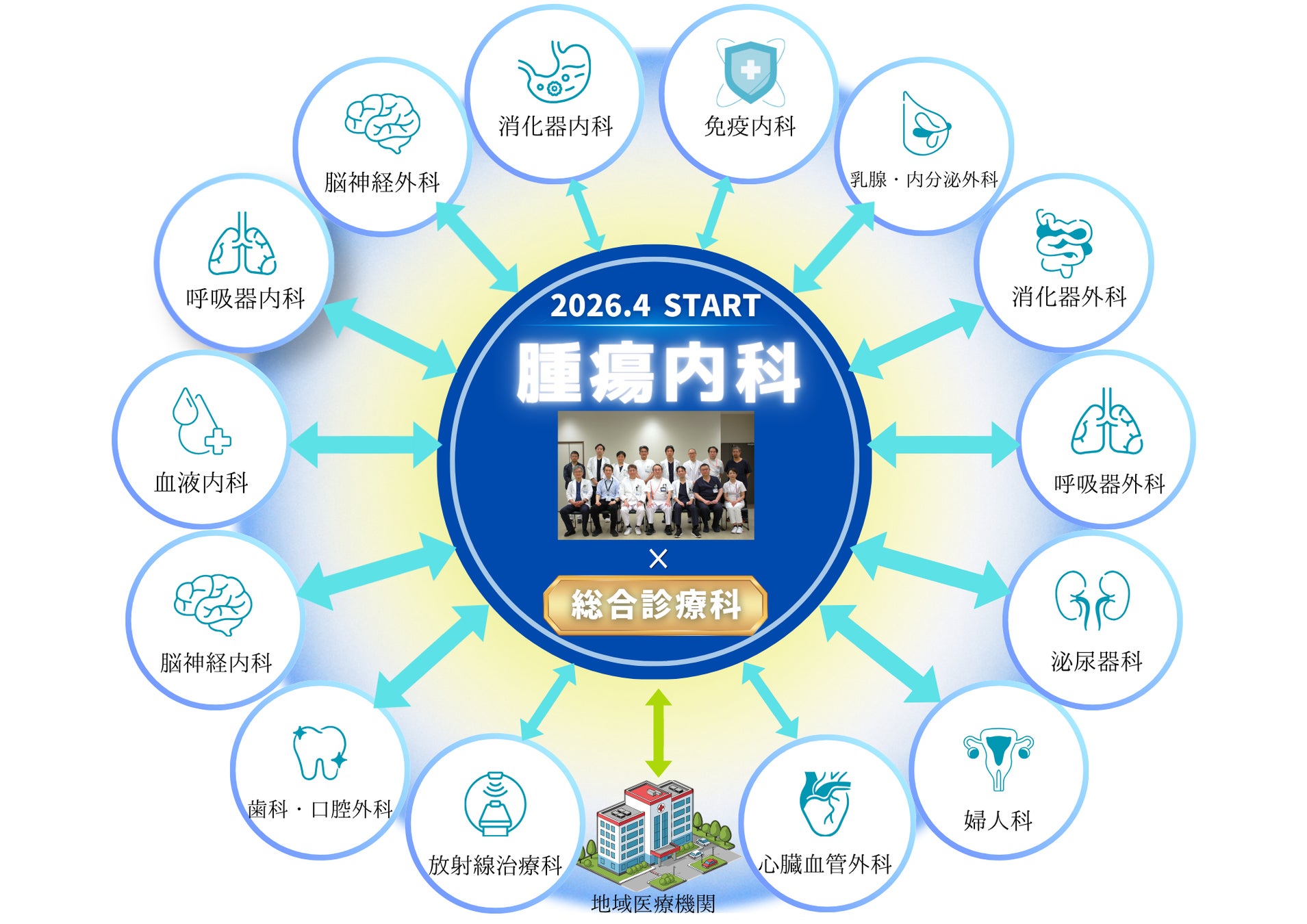 当院腫瘍内科は、総合診療科をはじめとした各診療科との密接な連携を特徴としています。臓器別がん診療科と協働しながら、主に薬物療法を軸としたがん診療を横断的に支援します。