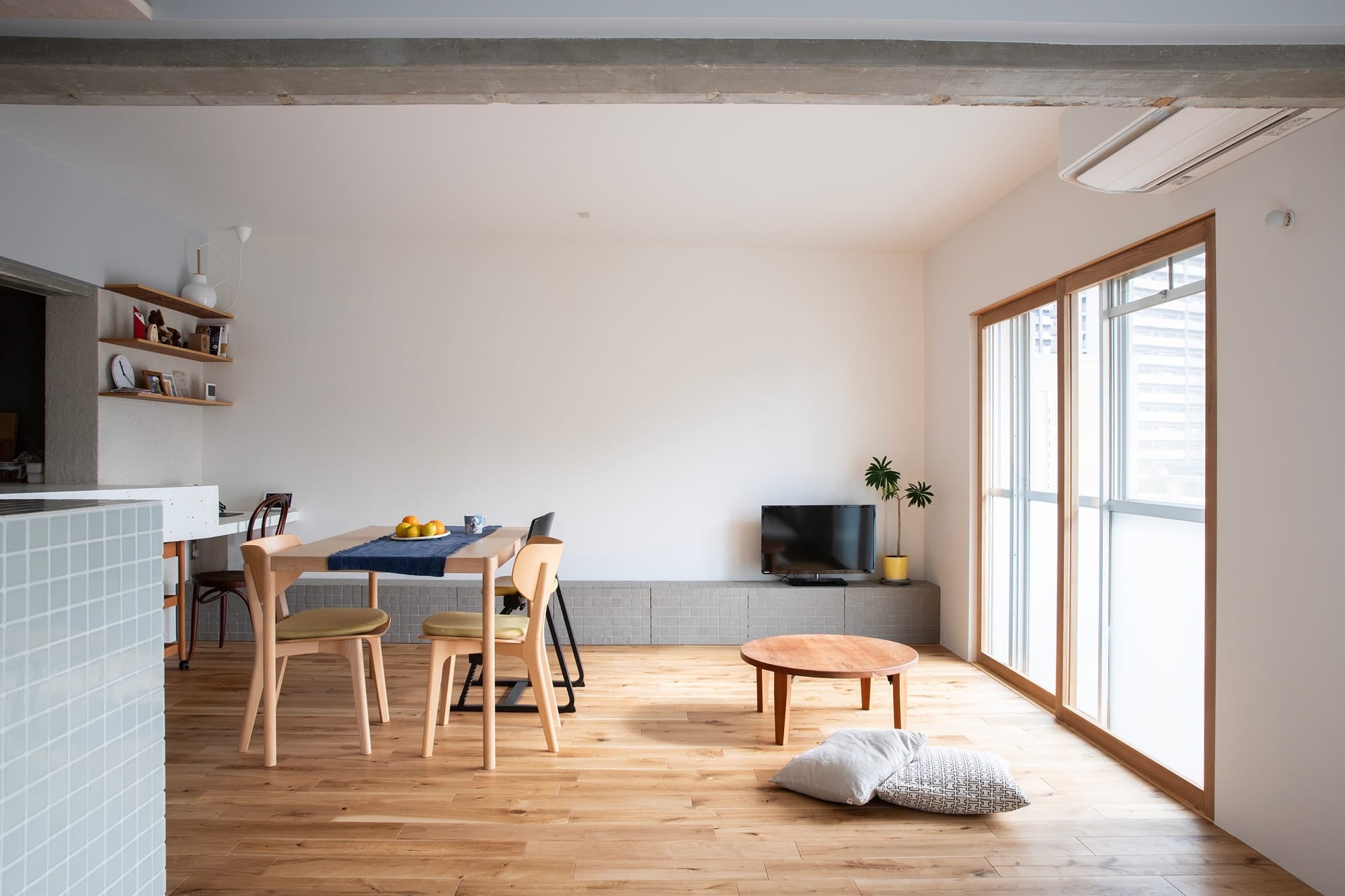 木製インナーサッシは、アルミサッシは外部のものと割り切ったうえで、室内側にもう一枚レイヤーを引き込み、「こっち側の世界」をつくることを目指しました。既存のアルミサッシを完全に覆い隠すことは目的とせず、木の存在感によって内と外を切り分けます。