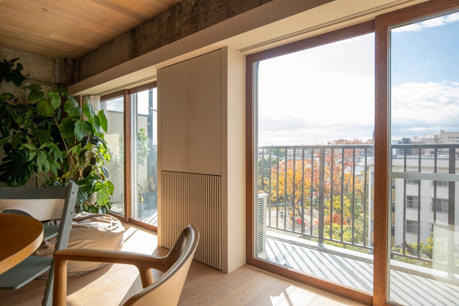 一方で建築家は、その制約条件の中でも窓辺を諦めず、内側に建具を造作することで、空間としての質を引き上げてきました。既存サッシを直接変更するのではなく、室内側に新たなレイヤーを設けるというアプローチです。
