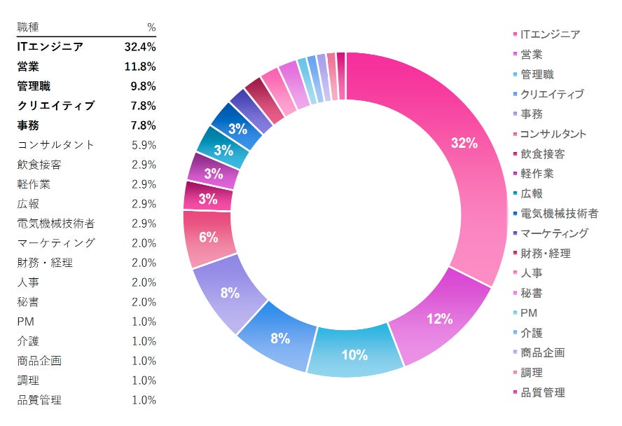 新規登録された求人のうち、「ITエンジニア」は32.4%で依然最多ですが、6月の63.0%から大幅に減少。他方、「営業(11.8%)」「管理職(9.8%)」「クリエイティブ(7.8%)」「事務(7.8%)」などがバランスよく構成され、全体として多様な職種への求人が進行中です。