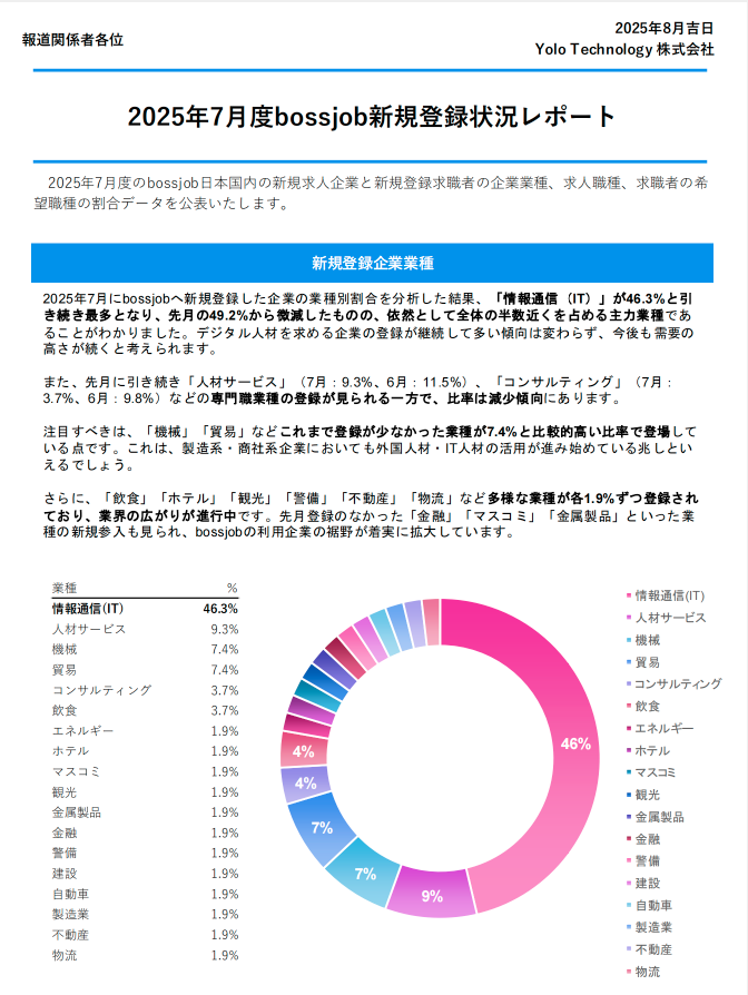 グローバル求人プラットフォーム「bossjob」を運営するYolo Technology株式会社(本社:東京都港区、代表:CHEAH JACK)は、2025年7月度の日本国内の新規登録企業および求職者の職種別・業種別傾向を公表いたしました。