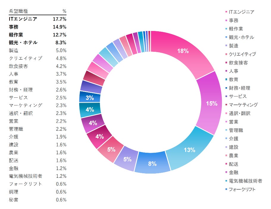 さらに、「観光・ホテル(8.3%)」「製造(5.0%)」「クリエイティブ(4.8%)」「教育(3.5%)」と続き、就業意欲のある外国人材が多様な分野で職を探していることが明らかになりました。