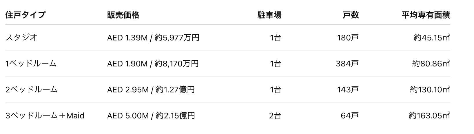 Yas Park Placeは、単身層からファミリー層まで幅広いニーズに対応する住戸構成を備えた、総戸数780戸の新規プロジェクトです。販売価格はAED 1.39M〜(約5,977万円〜)、完成は2030年4月頃を予定しています。住戸構成および支払いプランは以下の通りです。