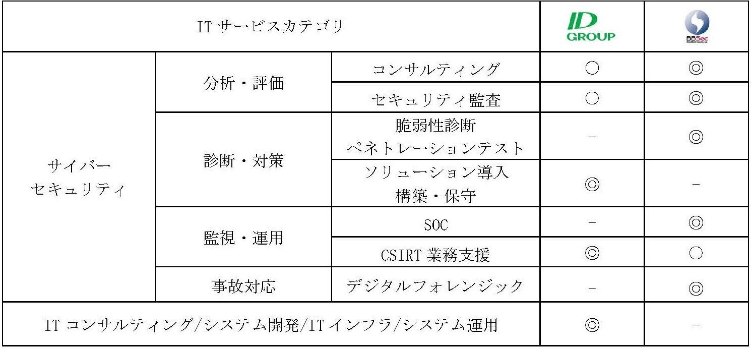 <IDグループとBBSecのITサービス領域分布> ◎:強みのある分野 ○:手掛けている分野