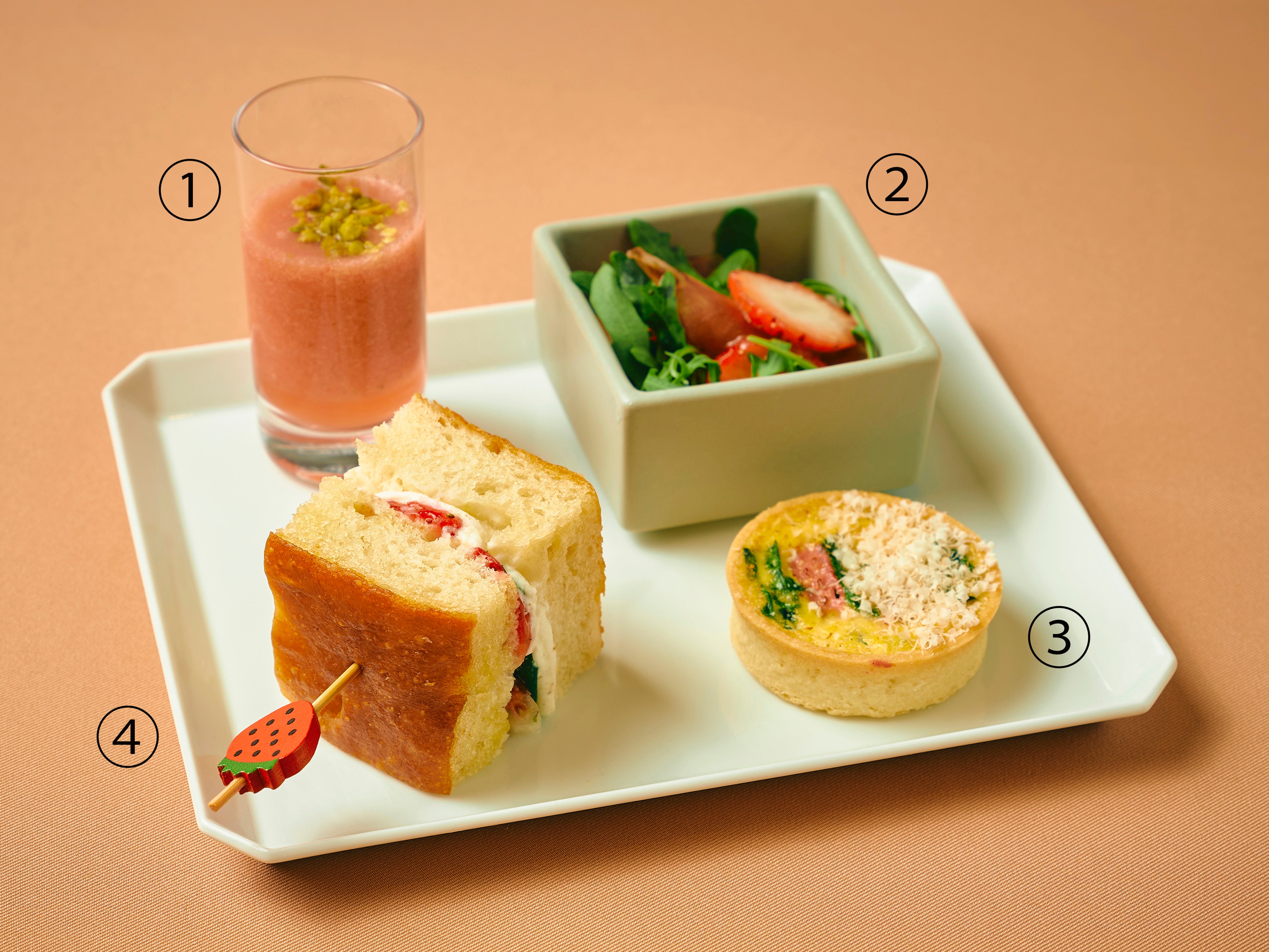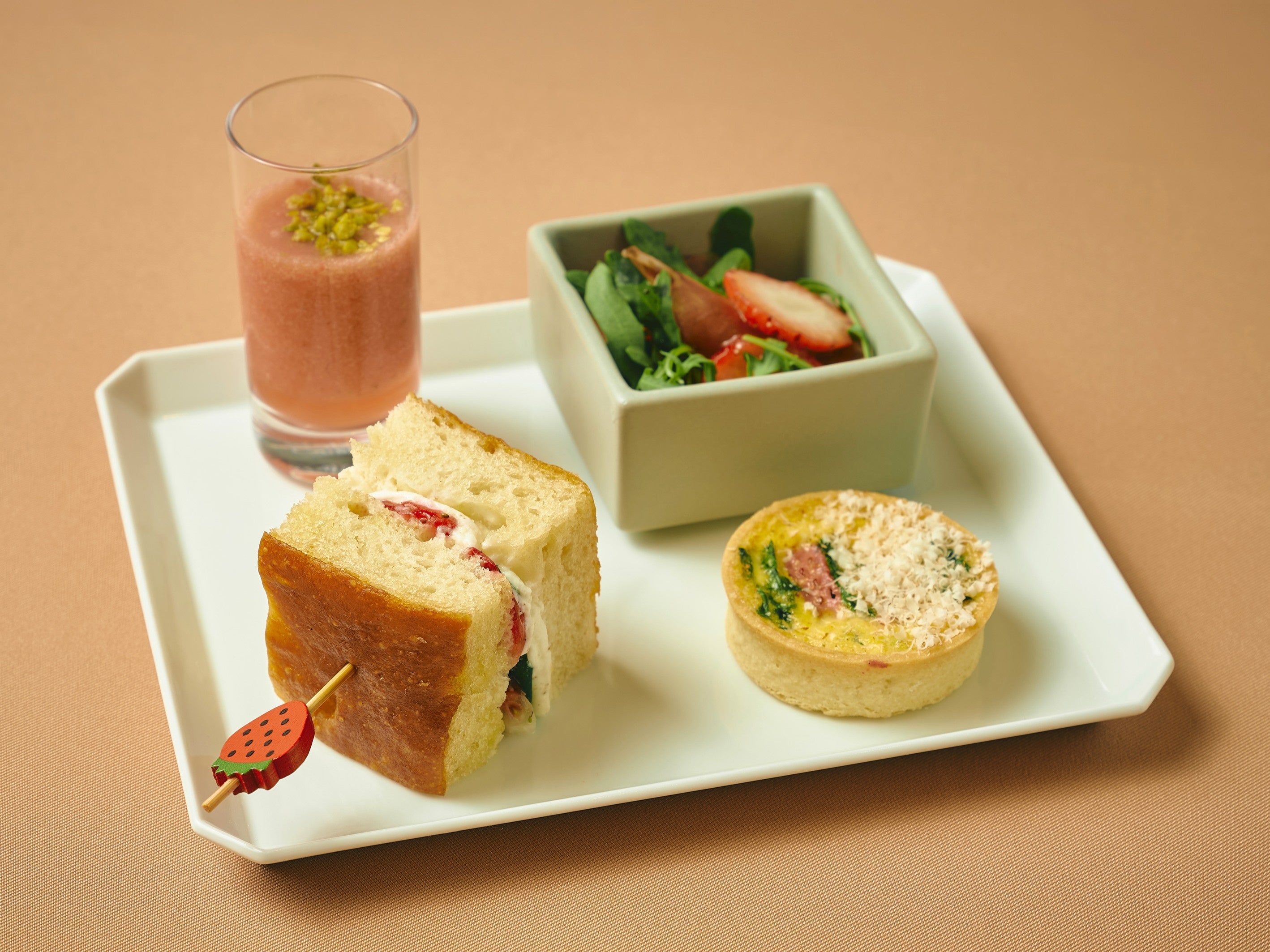 セイボリーでは、イチゴの風味を濃縮した「ストロベリーのガスパチョ」、甘酸っぱいイチゴと濃厚なブッラータチーズの絶妙なマッチングが楽しめる「ストロベリー、ブッラータチーズ、バジルのフォカッチャサンドイッチ」など、一口ごとに春の訪れを感じるラインアップ。