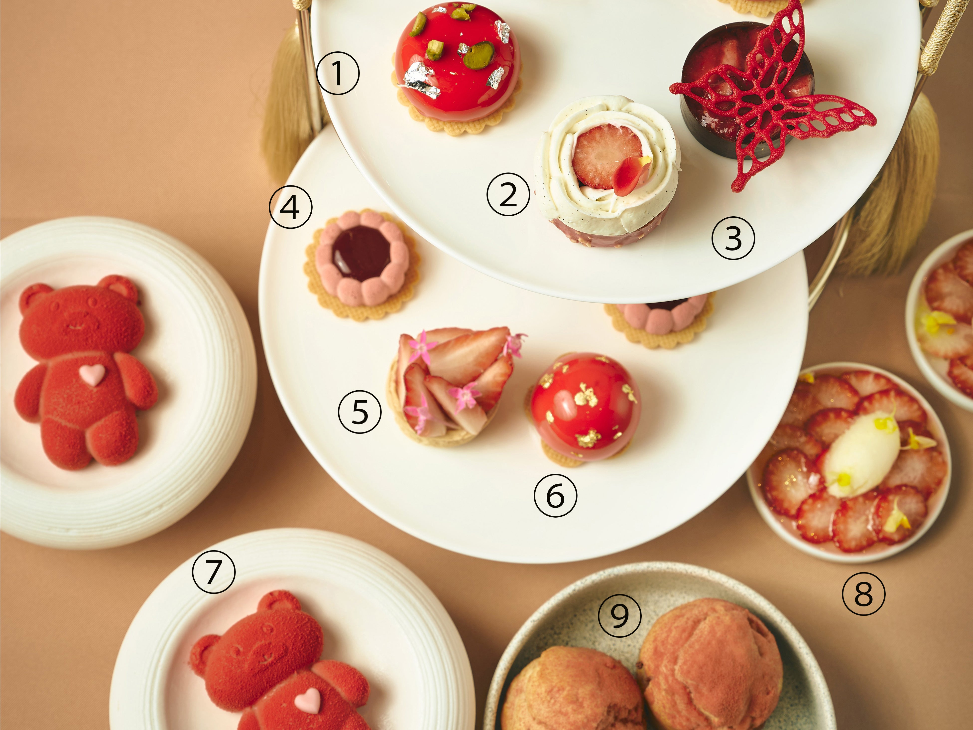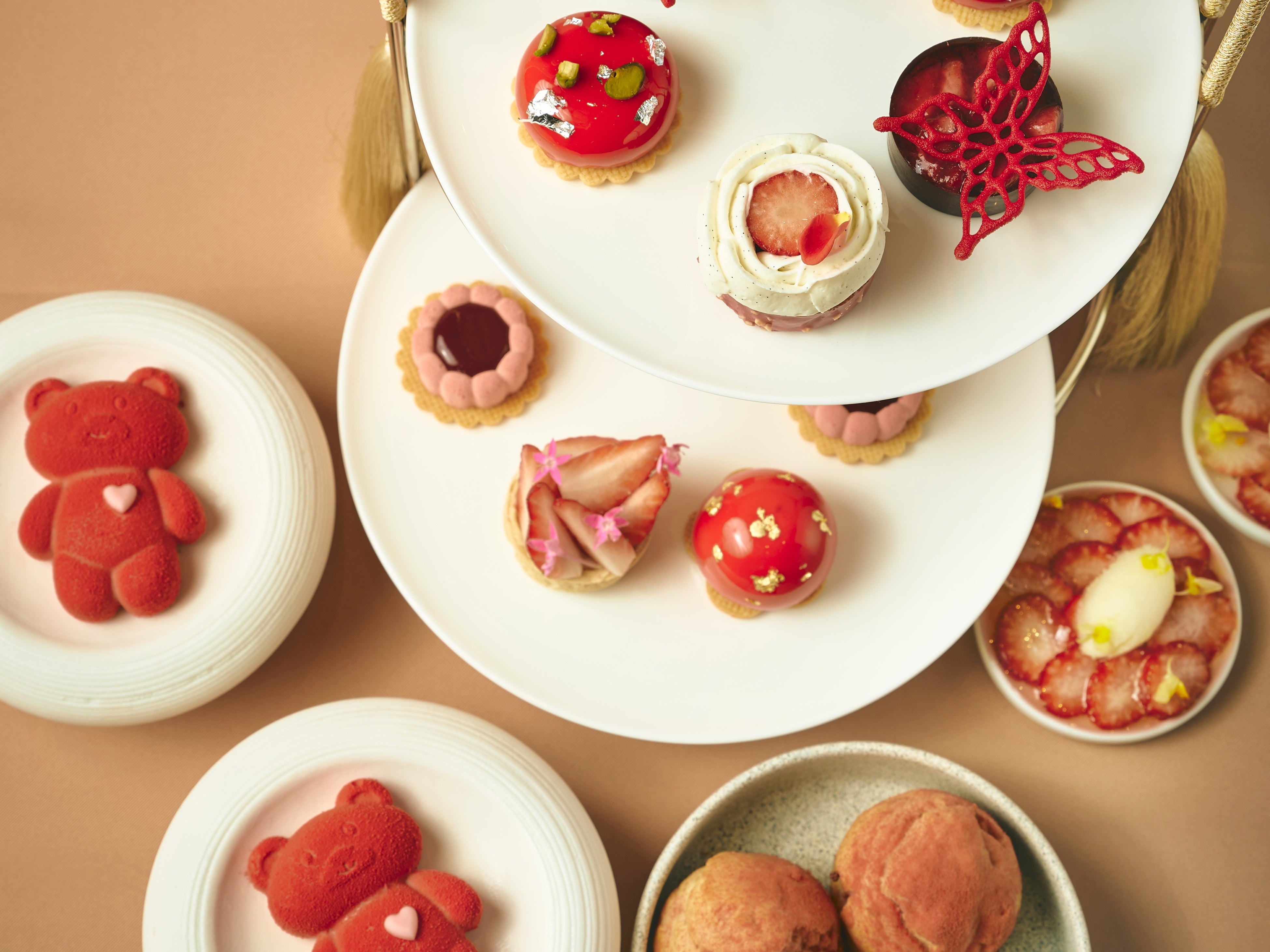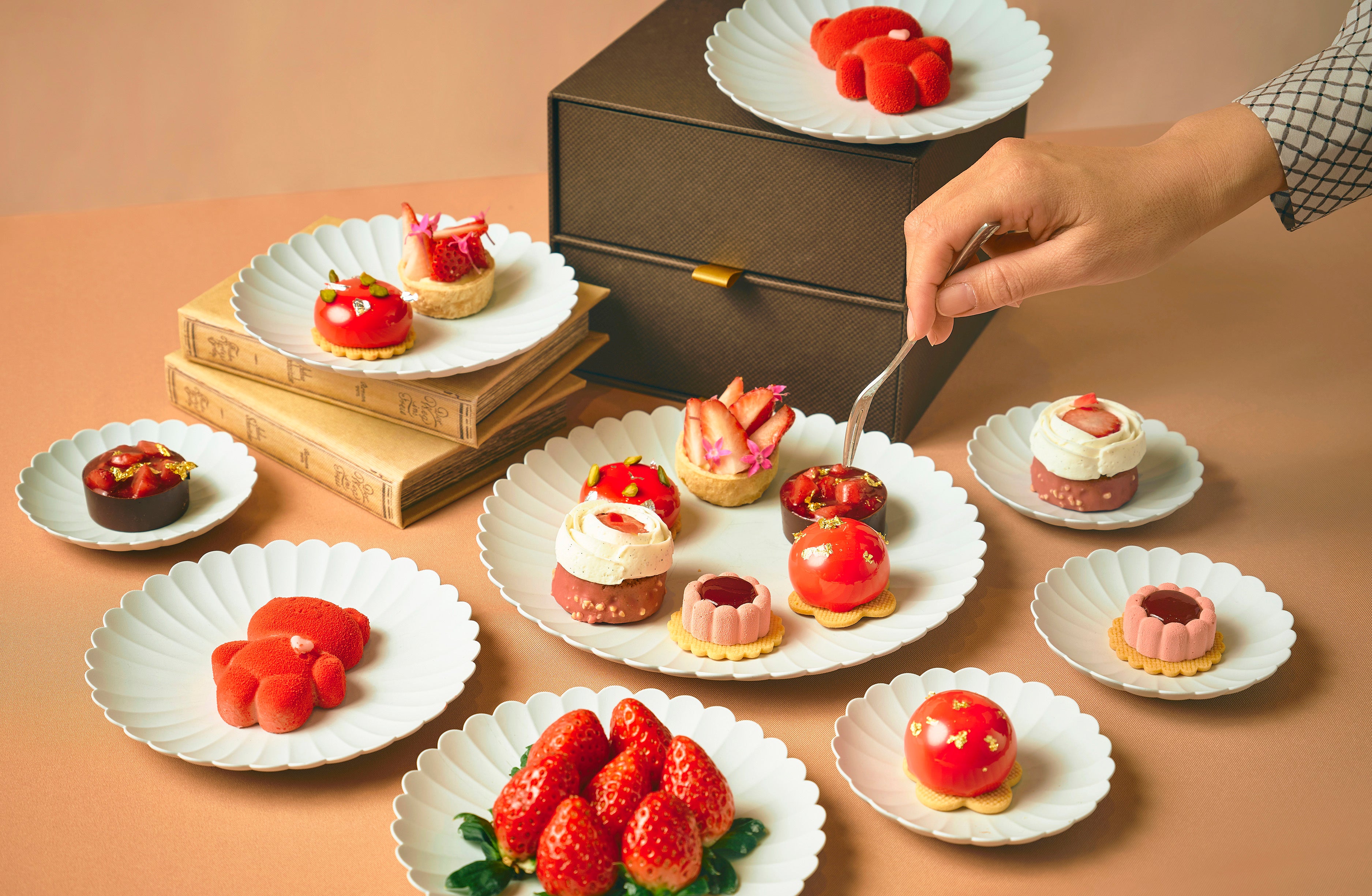 イチゴ本来の甘みが堪能できる「フレッシュストロベリーパイ」、深紅の蝶とチョコレートのコントラストが美しい「チョコレート・ベリータルト」、ローズゼリーとイチゴが奏でる繊細なハーモニーの「イスパハン」など、見た目も味わいも華やかなスイーツが並びます。