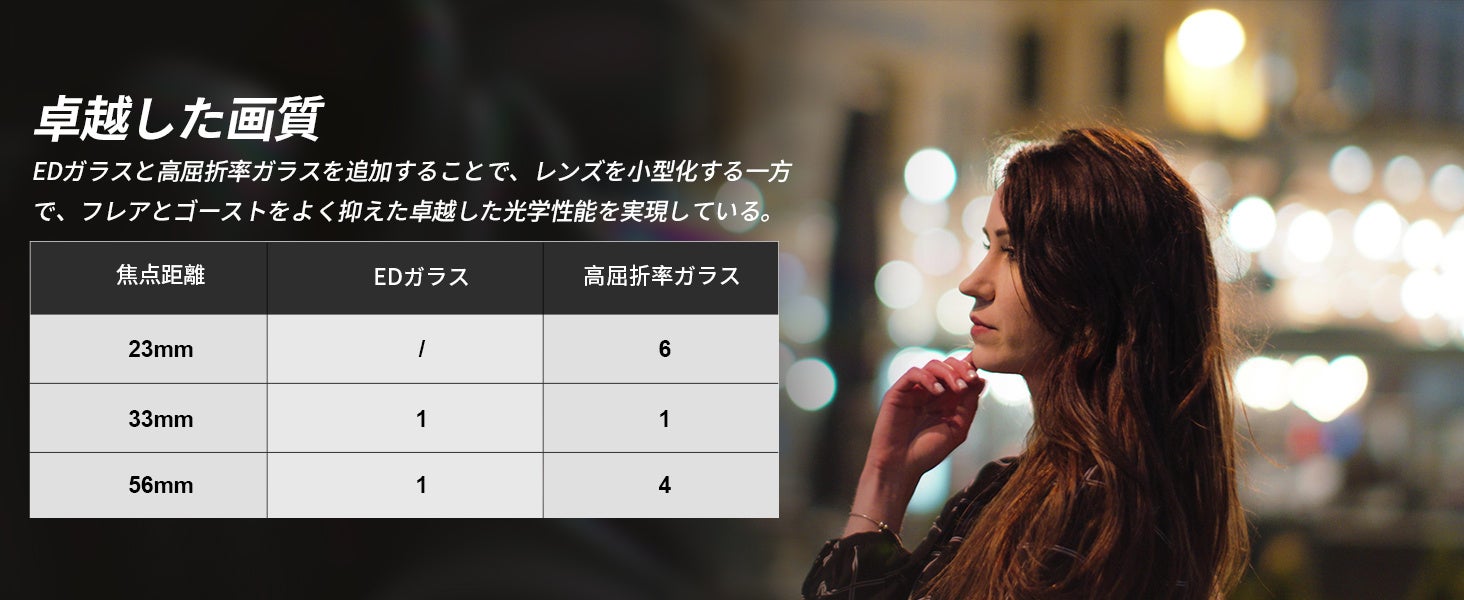 【優れた画質】ED ガラスと高屈折率ガラスを追加することでレンズサイズを縮小し、同時にフレアとゴーストをうまく制御して優れたオプション性能を提供します。