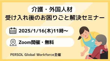 パーソルグループで外国人材に特化した人材サービスを提供するPERSOL Global Workforce(パーソル グローバルワークフォース)株式会社(本社:東京都港区、代表取締役社長:多田 盛弘)は、2025年1月16日(木)に介護施設向け「外国人材受け入れ後のお困りごと解決セミナー」を開催します。人材確保と労働力不足を解決するために、外国人材を受け入れたが、トラブルやお悩みがあるという方はぜひご参加ください。なお、本セミナーは無料です。