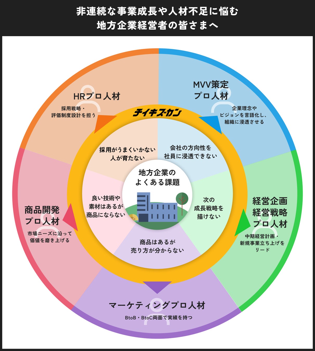 採用や組織づくり、経営戦略、新規事業開発、商品開発、マーケティングなど、あらゆる経営課題に対応できるプロ人材がいることが、チイキズカンの最大の強みです。