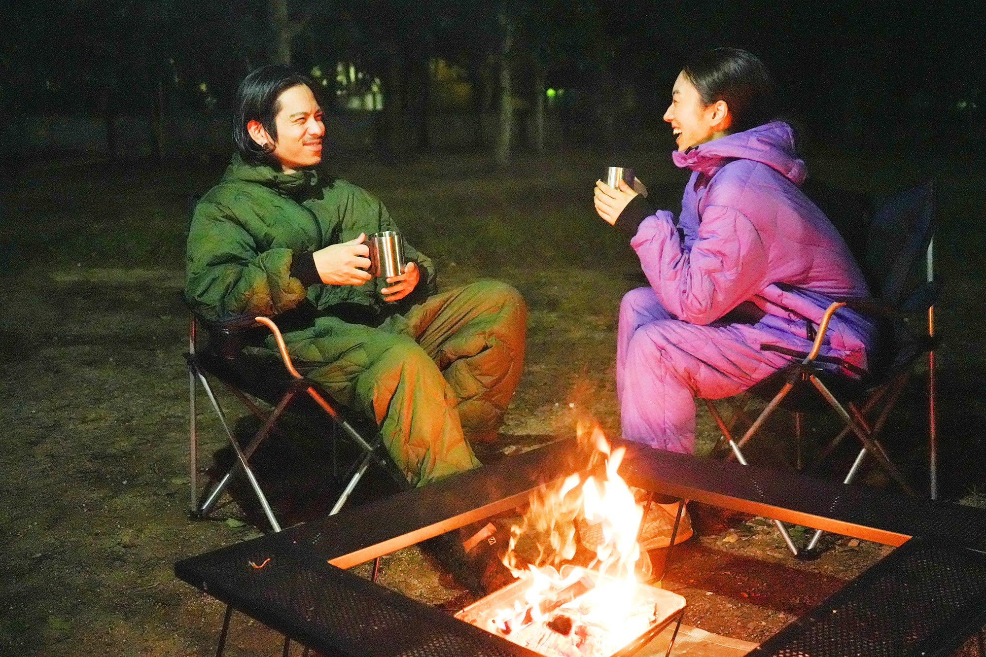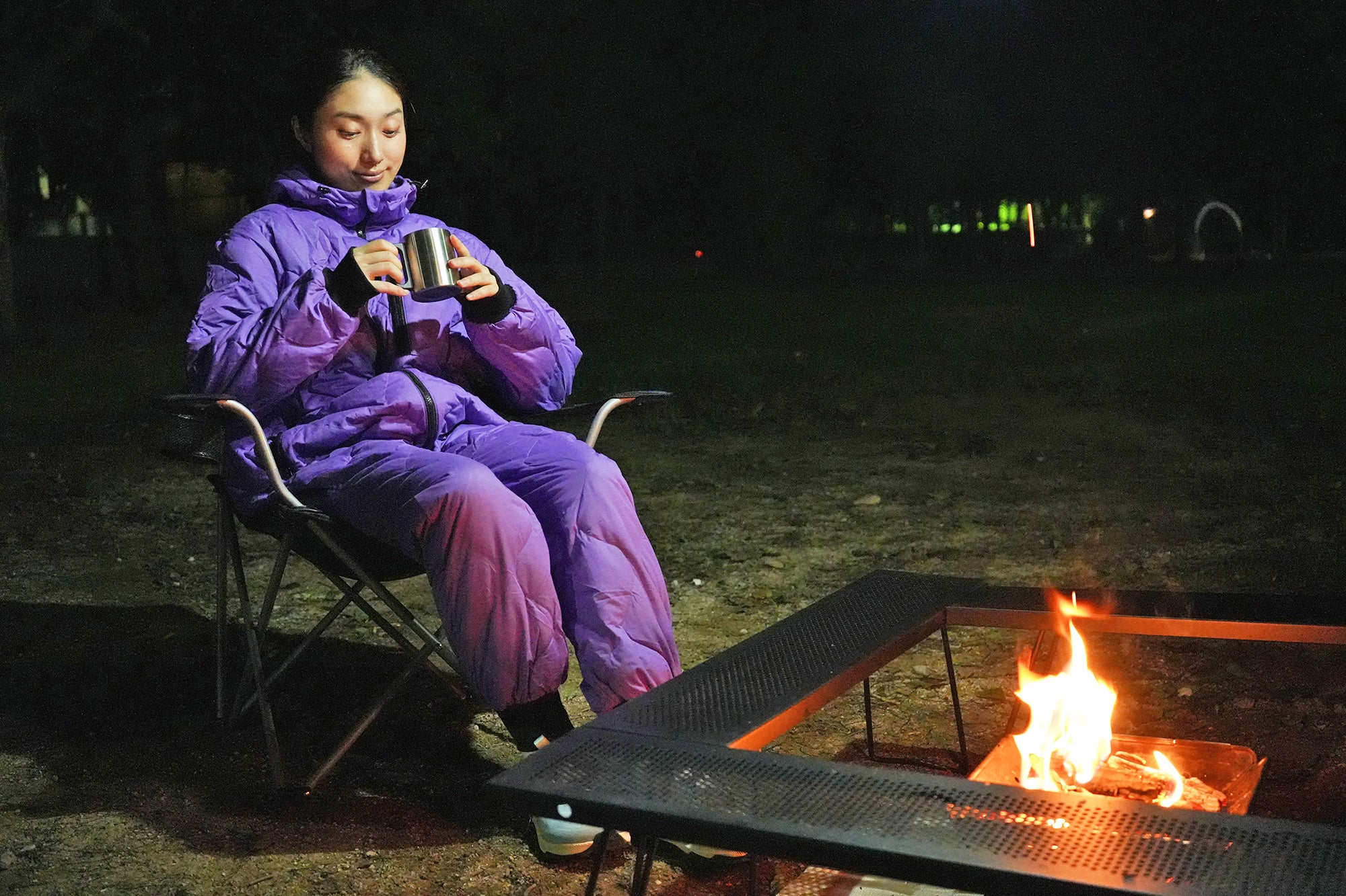 寝袋を着たまま焚き火も楽しめます。※火に近づきすぎないようにご注意ください。