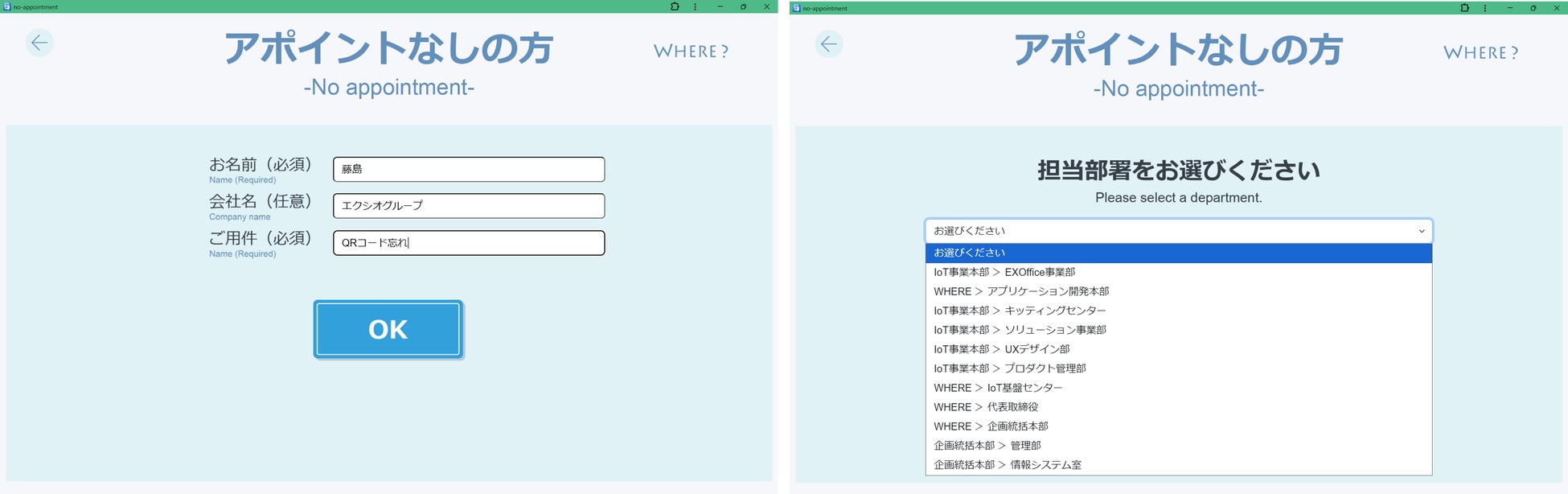 QRコードをお持ちでない方やアポイントのない来訪者の場合は、EXOfficeに登録された部署情報と連動した選択メニューから受付が可能です。