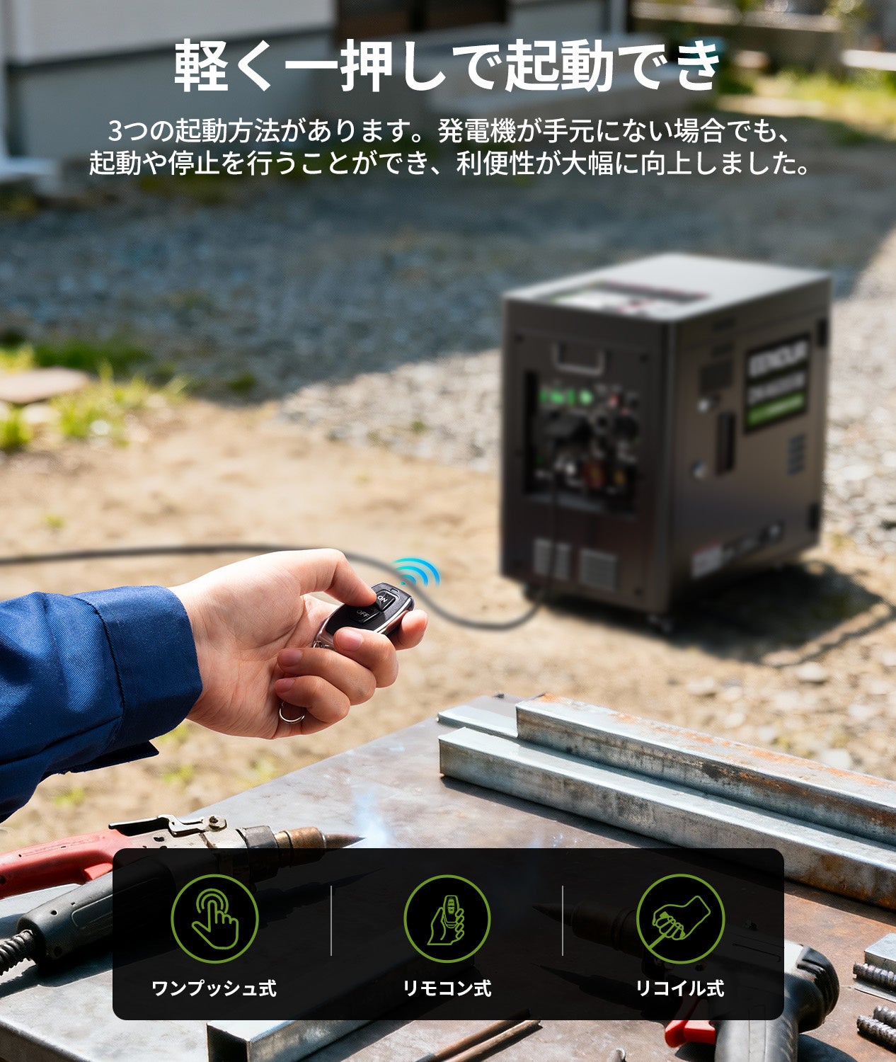 セルスターターとリコイルスターターに加え、遠隔リモートスタートにも対応。使用環境に合わせて柔軟に始動できます。