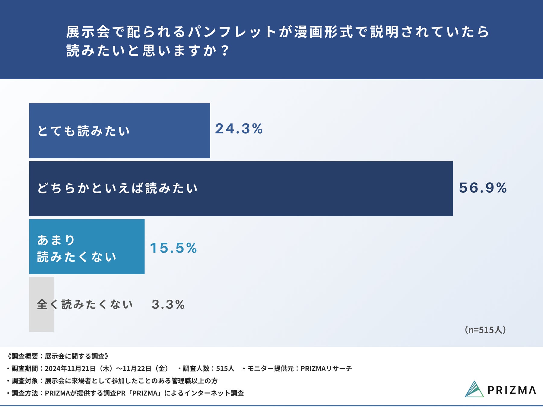 「Q10:展示会で配られるパンフレットが漫画形式で説明されていたら読みたいと思いますか?」と質問したところ、『とても読みたい(24.3%)』『どちらかといえば読みたい(56.9%)』『あまり読みたくない(15.5%)』『全く読みたくない(3.3%)』という結果になりました。
