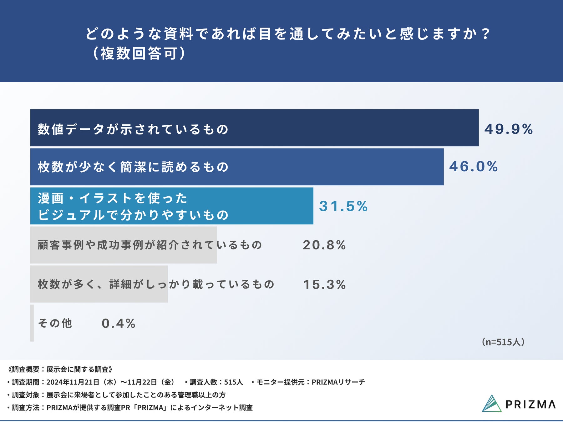 展示会で多くの出展者が配布している資料の中でも、目を通してみたい資料としては「数値データが示されているもの」が一番効果的だと分かりました。