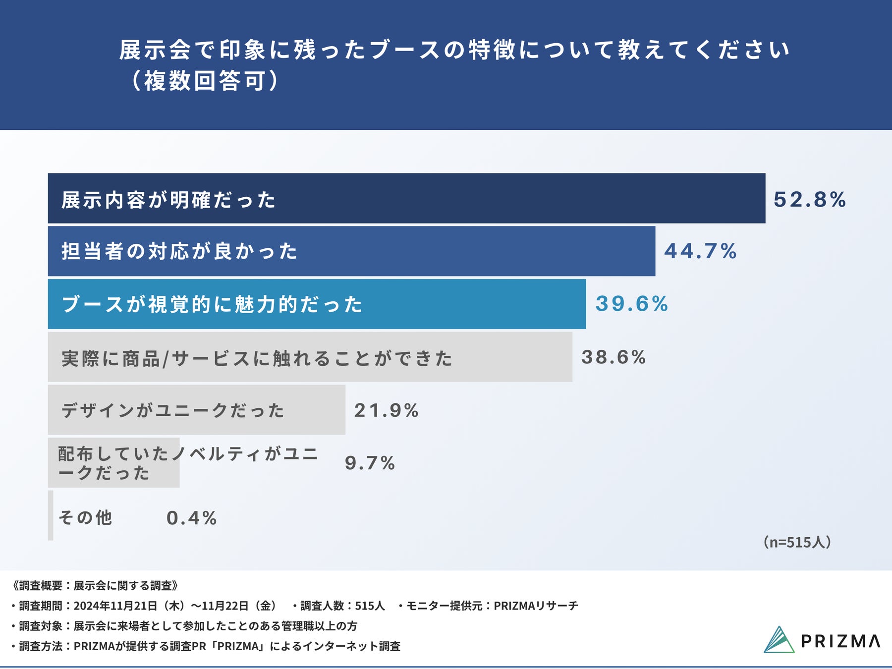 具体的に、印象に残ったブースの特徴としては、上位から「展示内容が明確だった」「担当者の対応が良かった」「ブースが視覚的に魅力的だった」が挙げられ、この辺りを工夫することが重要だと言えます。