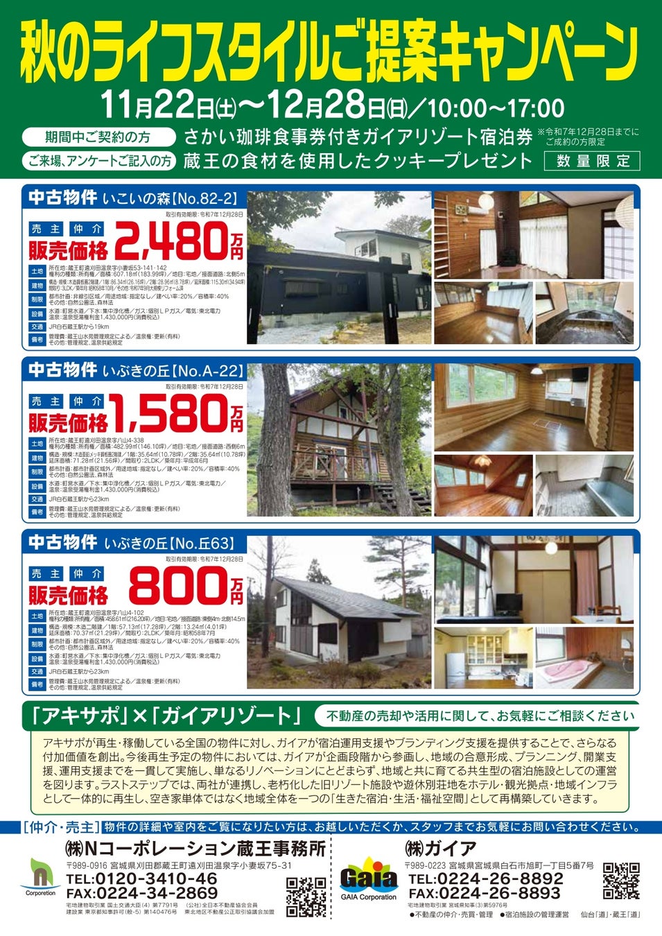 本キャンペーンは、東海住宅が建設した蔵王山水苑内の新築物件をガイアリゾートがプロデュースした家具や家電をお客様と一緒にセレクトし、より収益率の高い物件を作り上げていく提案型イベントとなっています。