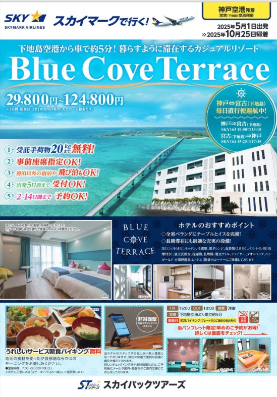 スカイパックツアーズ株式会社(本社:東京都中央区、社長:横山正巳)は、スカイマークを利用した価格固定型のパンフレット旅行商品「スカイマークで行く!宮古島/BlueBlue Cove Terrace」【神戸空港発着】(2025年5月1日出発~10月25日帰着)の販売を開始します。