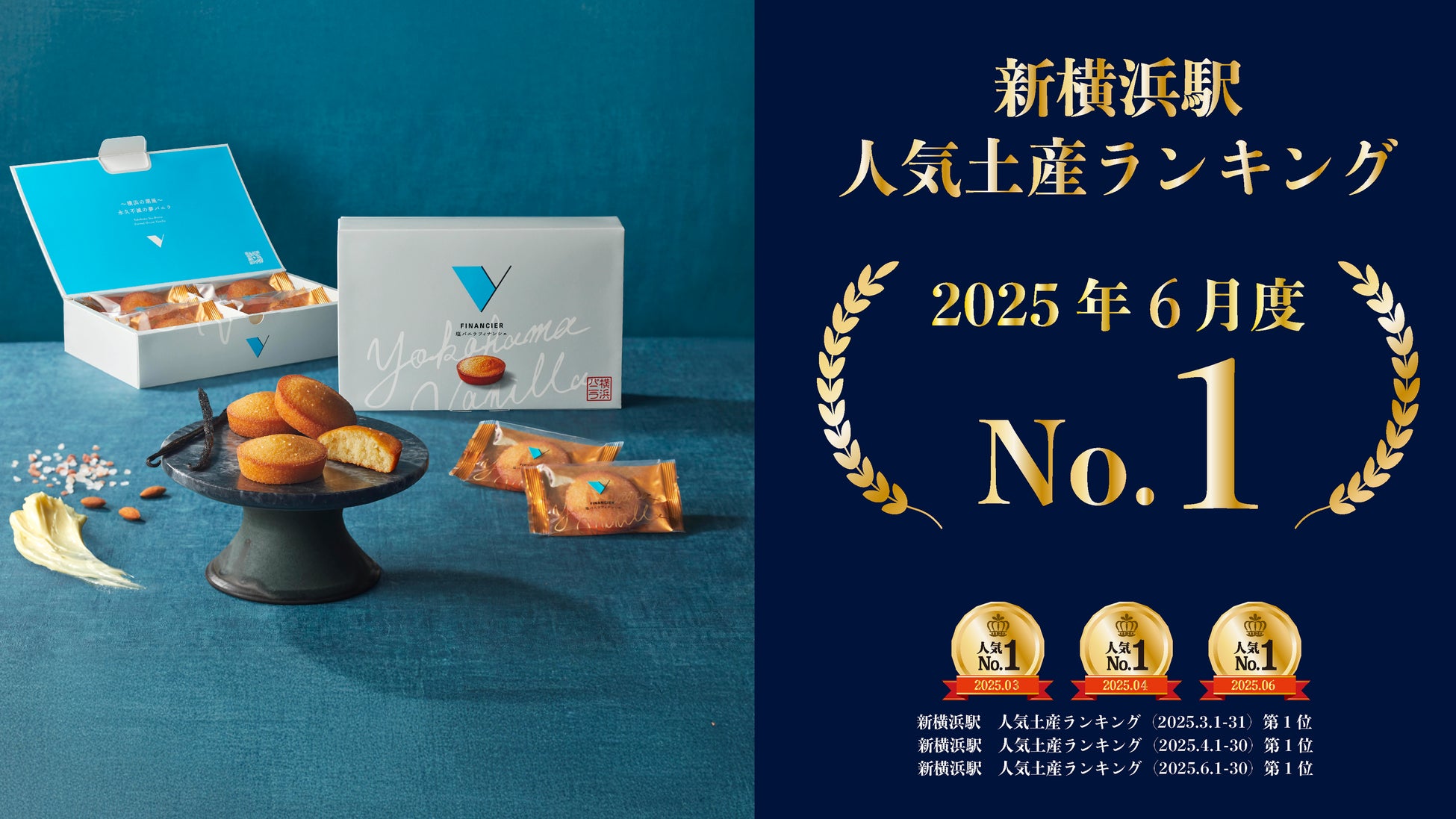 横浜発ギフトスイーツブランド『横浜バニラ』を展開する、横浜バニラ株式会社(神奈川県横浜市、代表取締役社長CEO 髙橋優斗、以下当社)は、株式会社JR東海リテイリング・プラス(以下JR-PLUS)が運営する「PLUSTAキュービックプラザ新横浜東(新横浜駅の新幹線東改札口前)」にて販売中の「塩バニラフィナンシェ(以下本商品)」が、2025年6月度のJR-PLUS 新横浜駅 人気土産ランキングにて3度目の第1位を獲得したことを発表いたします。