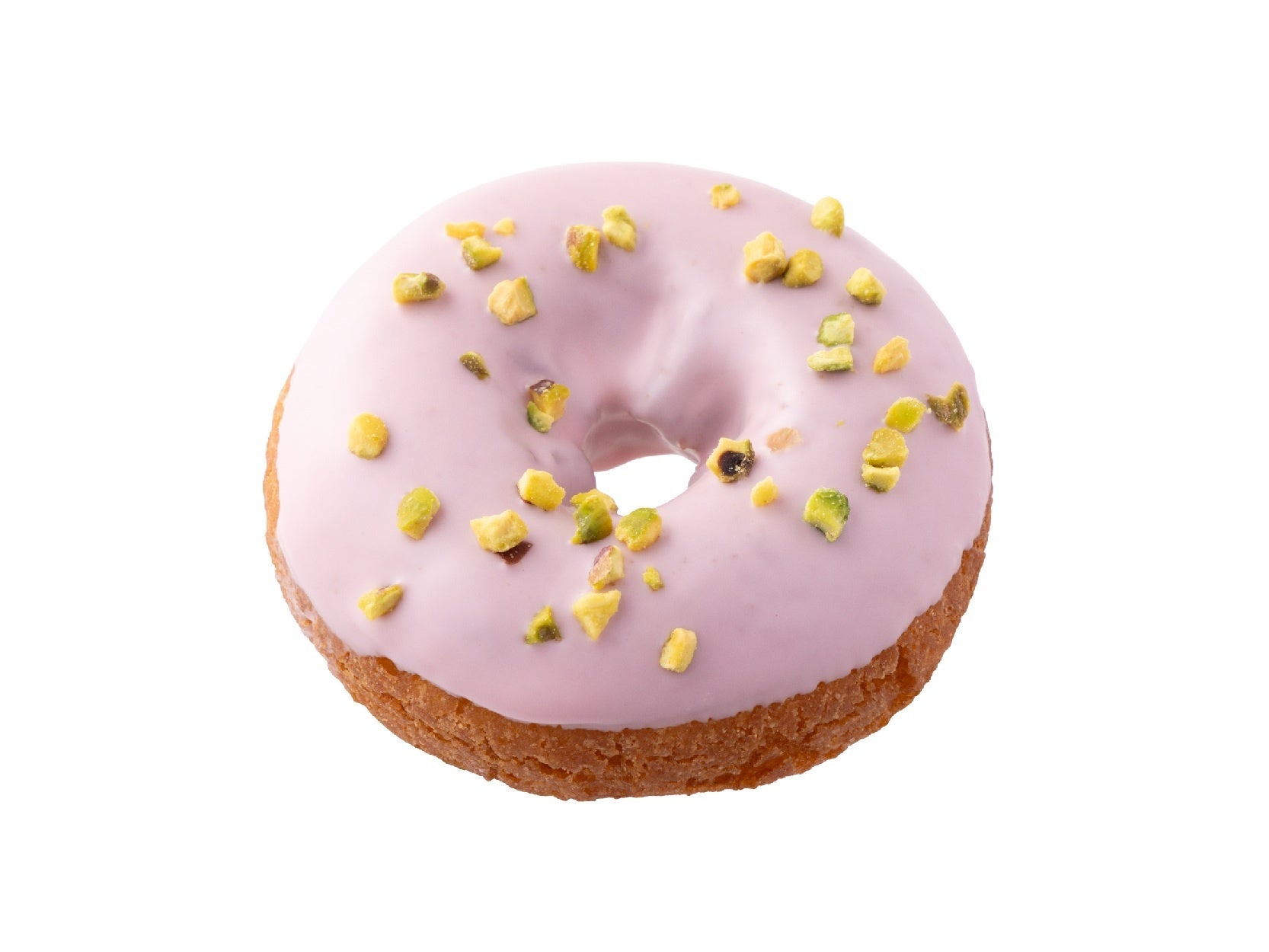 しっとりしたケーキ生地に、塩漬けした桜のパウダーを練りこんだチョコレートをコーティングし、砕いたピスタチオをトッピングしました。淡いピンクの色合いが春らしい季節限定ドーナツです。