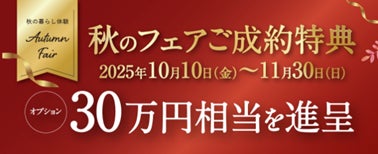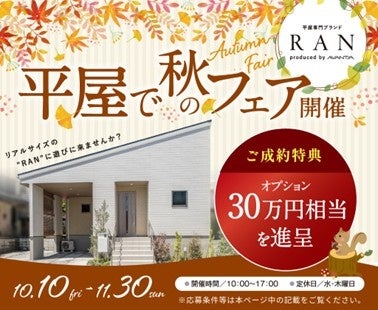 本フェア期間中、「RAN」をご成約かつ、「2026年4月までに着工、同年8月末までにお引渡し」をさせていただいた方を対象に、30万円相当のオプションを進呈させていただく、「秋のフェアご成約特典」をご用意しました。ぜひこの機会に、季節とともに暮らす平屋の魅力をご体感ください。