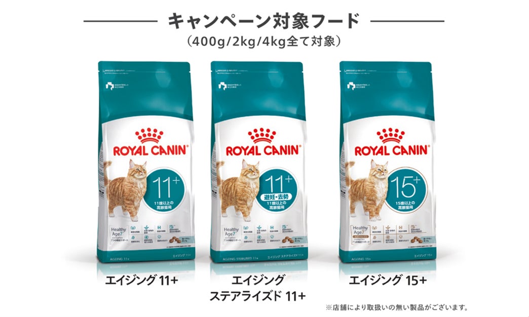 対象フード「フィーライン ヘルス ニュートリション(FHN)」の「エイジング11+(11歳以上向け)」、「エイジング15+(15歳以上向け)」および「エイジング ステアライズド11+(避妊・去勢した11歳以上向け)」の3製品のいずれかの購入レシートと購入した対象フードを一緒に撮影した画像、または公式オンラインストア マイロイヤルカナン(https://shop.royalcanin.jp/)で購入した商品名がわかる納品書の写真をキャンペーンサイトでアップロードし、アンケートと必要事項を記入して応募すると、抽選で5,000円分のPayPayポイントが200名様に当たります。