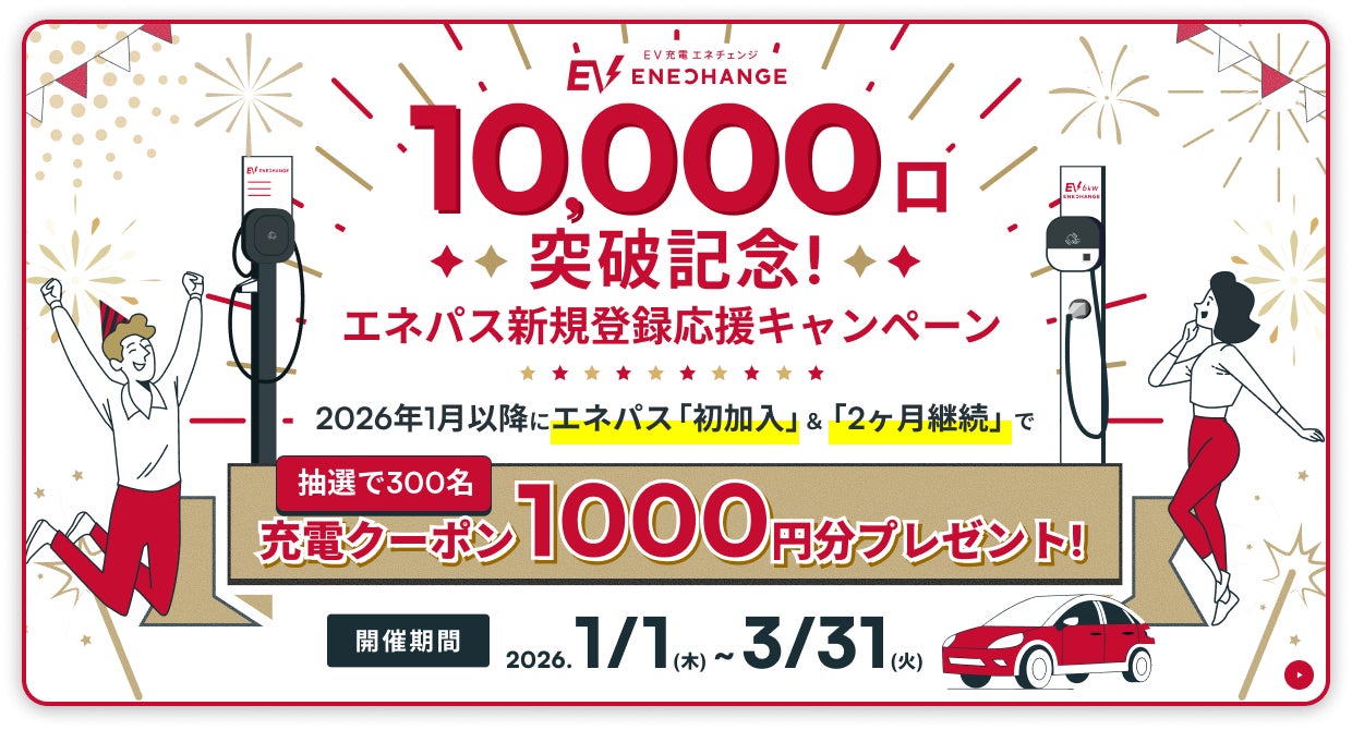 ・内容:期間中に「エネパス」に初めて加入し、2ヶ月継続いただいた方を対象に、抽選で300名に「EV充電エネチェンジ」で利用可能な1,000円分の充電クーポンをプレゼントいたします。