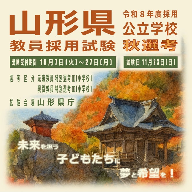 山形県教育委員会では、他県から「山形県へ戻りたい」、「山形県へ移住したい」と考えている教員のニーズに応えるため、令和8年度採用山形県公立学校教員選考試験の秋選考を、今年度、初めて実施します。