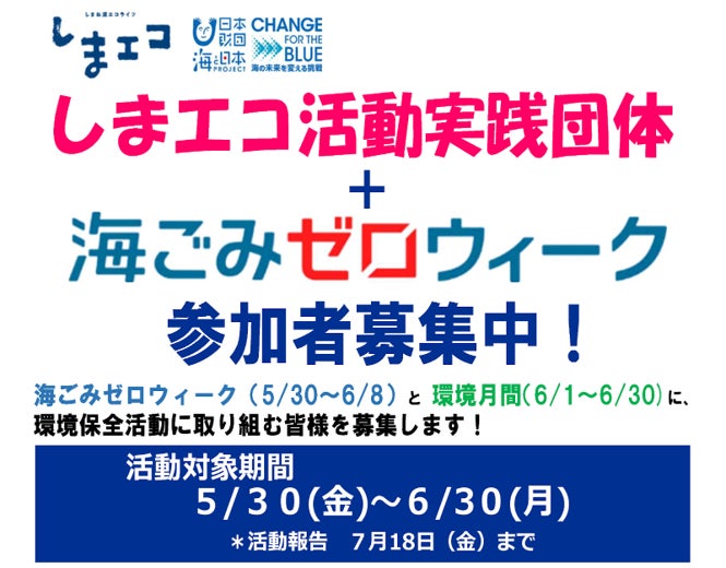 一般社団法人 海と日本プロジェクトinしまねは、5月30日(金)の海ごみゼロウィーク開始日から、6月の環境月間に合わせて、島根県環境政策課とコラボレーションし、島根県内の企業や団体、学校などの環境保全活動を募集する「しまエコ活動+海ごみゼロウィーク」を実施いたします。
