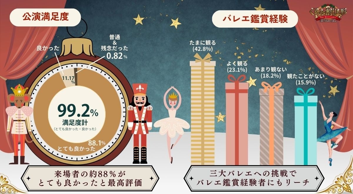 「今回の演目の選択(くるみ割り人形)についてどう思われましたか?」という問いに対しては、「大変良かった(85.5%)」、「良かった(13.2%)」、「どちらでもない(1%)」、「悪かった(0.3%)」という結果となり、演目選定そのものについても非常に高い評価を得ました。