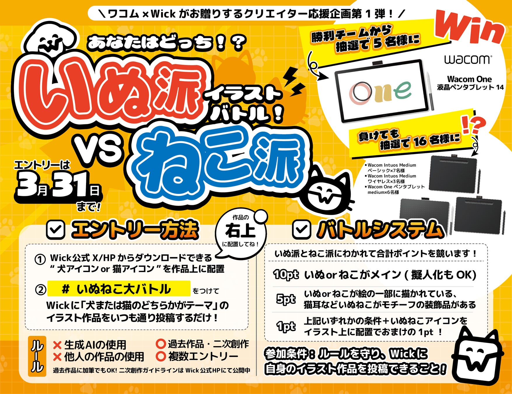株式会社Wick(代表取締役:中道 慶謙)は、ペンタブレットなどの開発や販売を行う株式会社ワコムとのコラボキャンペーンとして、抽選でワコム商品が当たるクリエイター応援企画「いぬ派VSねこ派イラストバトル」開催をお知らせします。