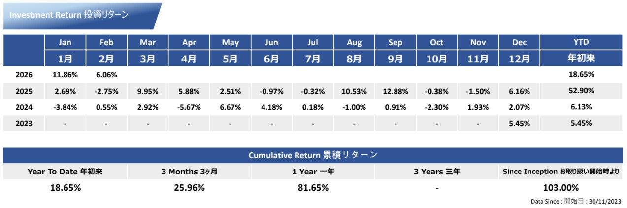 2026年2月のリターンは6.06%でした。これにより手数料差し引き前の累積リターンは直近1年が81.65%、積立開始からは103%となりました。