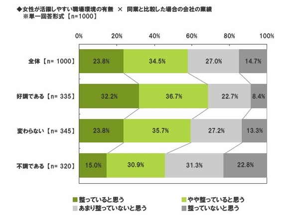 次に、女性が活躍できる職場環境が整っているかどうかを会社の業績別で見ると「同業者と比較して好調である」と回答した人(335名)の会社の場合『女性が活躍しやすい職場環境が整っている』(「整っている」32.2%、「やや整っている」36.7%)と回答したのは68.9%という結果となりました。また、「同業者と比較して変わらない」と回答した人(345名)の会社の場合『整っている』(「整っている」23.8%、「やや整っている」35.7%)という回答は59.5%という結果となりました。さらに、「同業者と比較して不調である」と回答した人(320名)の場合、『整っている』(「整っている」15.0%、「やや整っている」30.9%)と回答したのは45.9%となっており、女性が活躍できる職場環境の有無と会社の業績の間には相関関係があることが推察できます。