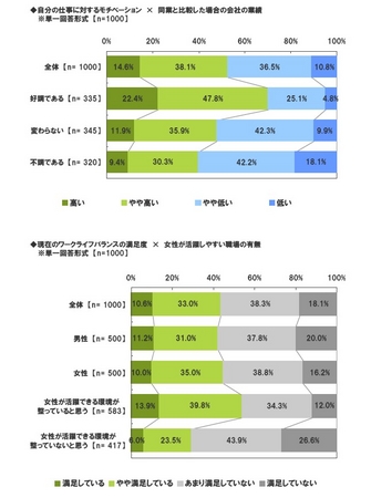 このようにワークライフバランスの充実と女性が活躍できる職場環境の有無の関係には、相関関係があること推察できる結果となっています。