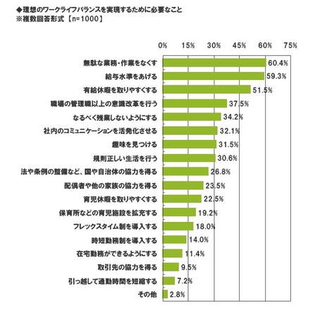 20代~40代の有職者の男女1000名に対し、理想のワークライフバランスを実現させるために必要なことは何かを複数回答形式で聞いたところ、1位「無駄な業務作業をなくす」60.4%、2位「給与水準をあげる」59.3%、3位「有給休暇を取りやすくする」51.5%、4位「職場の管理職以上の意識改革を行う」37.5%、5位「なるべく残業しないようにする」34.2%という結果となりました。