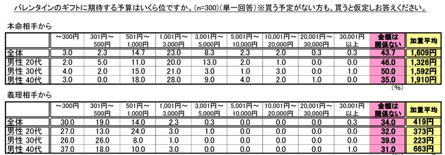 バレンタインギフトに期待する予算では、本命相手に期待する平均予算が約1,609円(昨年:約2,716円)と、昨年より1,107円(約4割減)減少していることが分かった。世代別では、20代約1,326円、30代約1,592円、40代約1,910円と、40代男子が最も貰えるバレンタインギフトの予算を高く見積もっていることが分かった。