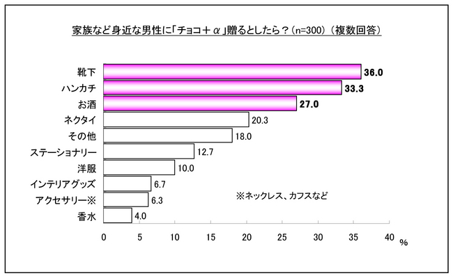 また「家族など身近な男性へ「チョコ+α」で贈るとしたら?※」の質問に対しては、1 位「靴下」(36.0%)、2 位「ハンカチ」(33.3%)、3 位「お酒」(27.0%)という結果となった。