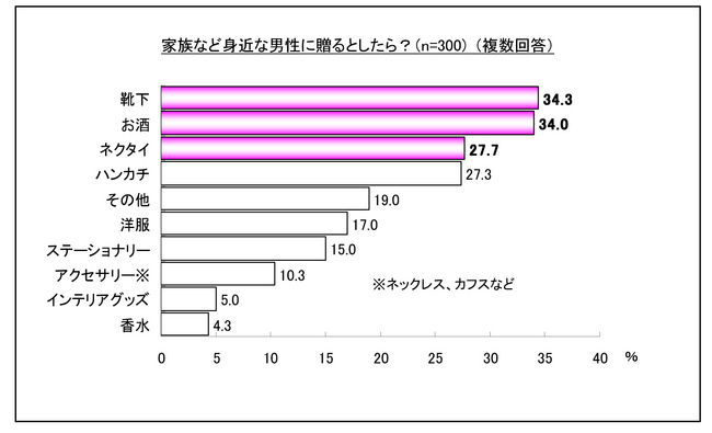 家族など身近な男性に贈りたいのは、1位「靴下」、2位「お酒」、3位「ネクタイ」