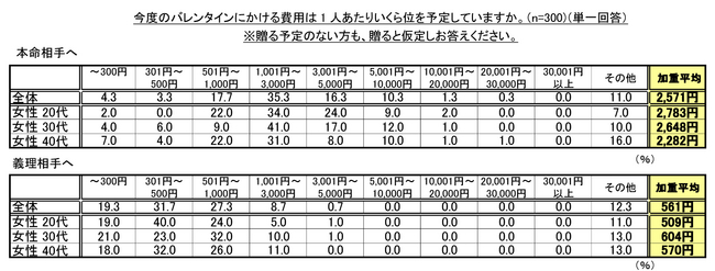 Q:今度のバレンタインにかける費用は1人あたりいくら位を予定していますか。(n=300)(単一回答)