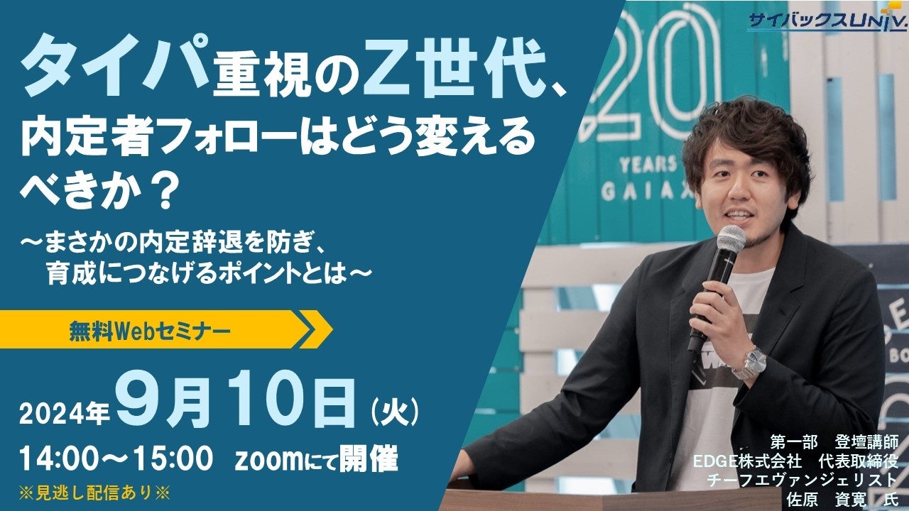 また、従来の採用活動方法や、内定者フォローに課題を感じる方に向け、特別セミナー「タイパ重視のZ世代、内定者フォローはどう変えるべきか?」を2024年9月10日(火)に開催いたします。累計5,500社の内定者フォロー支援実績をもつEDGE株式会社 代表取締役 佐原資寛氏を講師に迎えて、内定辞退を防ぎ、育成につなげるポイントを徹底解説します。見逃し配信ありの無料セミナーとなっていますので、ぜひお申込みください。