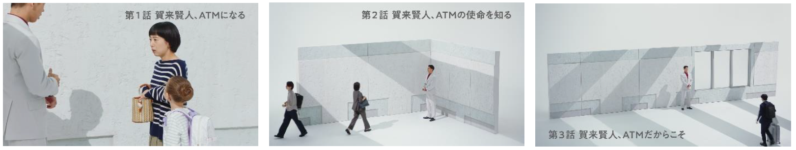 朝、目覚めると見知らぬ抽象的な空間に立っている賀来さん。「ここはどこ?なに?」と混乱する賀来さんが声を発そうとすると、なぜか口からは、セブン銀行ATMでおなじみの「タリラリララン♪」が飛び出します。戸惑う間もなく目の前に現れたのは、お財布を忘れたお母さんと娘。「しまった!財布忘れた…」とのお母さんの心の声が聞こえた賀来さんは、身振り手振りで、スマホを使ってお金の入出金ができることを知らせます。「スマホATM」サービス※を通じて無事に出金ができ、笑顔になったお客さまを前に、賀来さんも「よかったぁ、俺そんなことまでできるんだな」と思わず感心。ATMとして生きていくこととなった賀来さんの、新たな挑戦が始まります。
