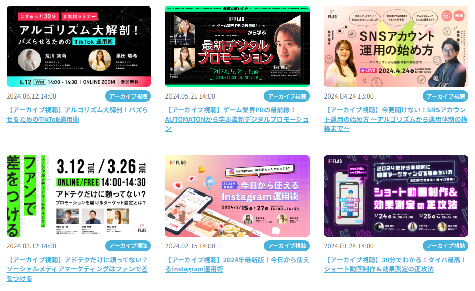 フラッグは最新のソーシャルメディアマーケティングの最新事例、ソーシャルメディアの活用方法などを中心に、マーケティング・プロモーション担当者の方々に向けの無料セミナーを定期開催しています。