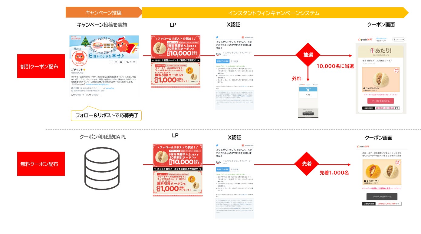 デジタルクーポン配信システム「プチギフト(R)」を提供する、株式会社エムディーピー(以下「MDP」、東京都港区、代表取締役:星田洋伸)は、全国のファミリーマートにて利用可能な、新機能「利用通知API」を活用して事前に抽選で受け取った割引クーポンを店舗で使って対象商品を購入するとその特典として先着で店頭にて使える無料クーポンがもらえるキャンペーンが実施可能なASPをリリースし、テストキャンペーンを同時に実施いたしました。