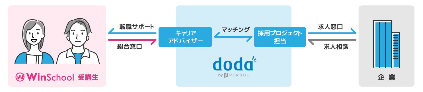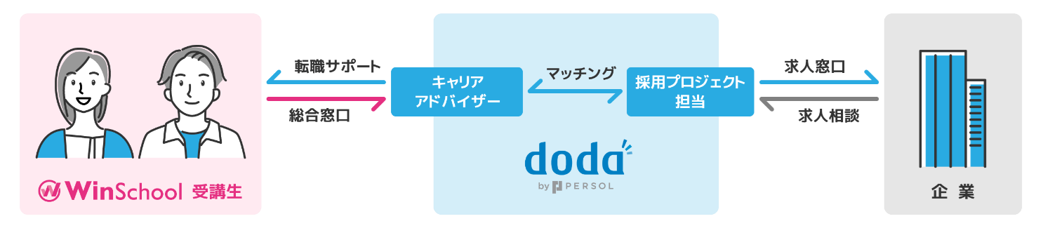 Winスクールによるスキルアップ×転職サービス「doda」による転職支援によって、Winスクール受講生のキャリアアップを強力にサポート
