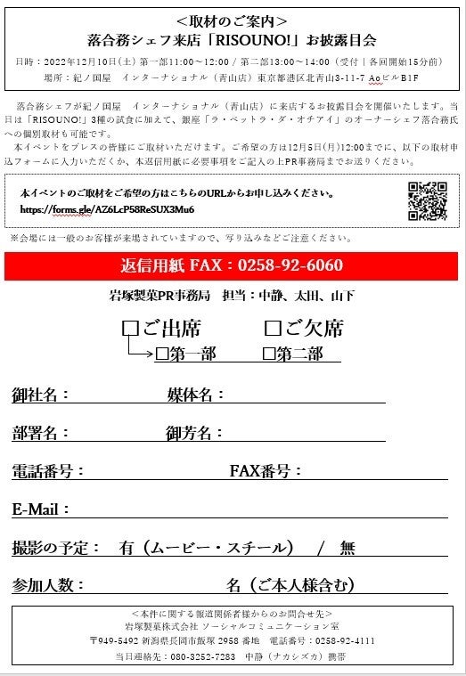 本イベントをプレスの皆様にご取材いただけます。ご希望の方は12月5日(月)12:00までに、以下の取材申込フォームに入力いただくか、本返信用紙に必要事項をご記入の上PR事務局までお送りください。