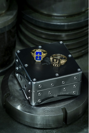 男のロマンを象った飛行機と、家族を守る気持ちを表す柏の葉と勇敢さの象徴である雉をモチーフとした2型。リングとケースに同じシリアルナンバーが刻印されます。