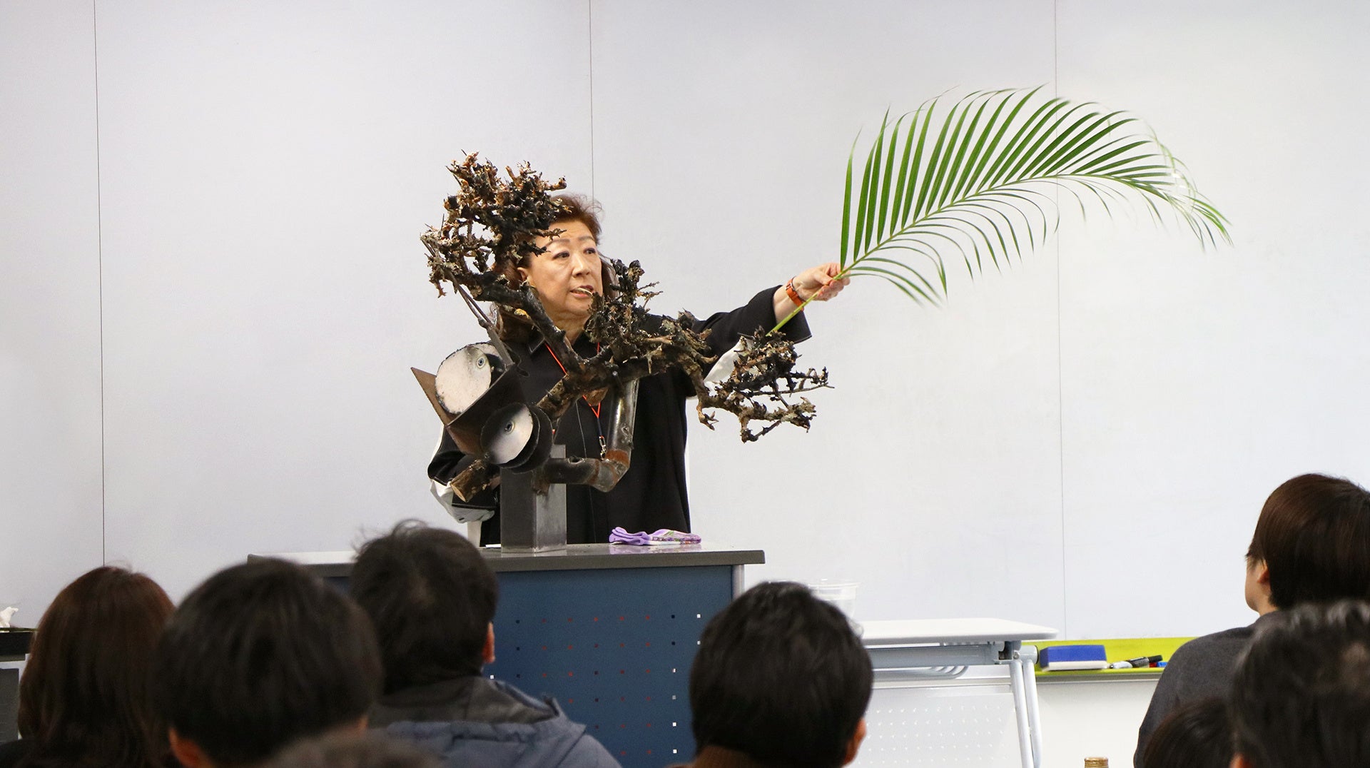 ビジネスの第一線で活躍する受講生を前に、草月流が長年大切にしてきた創造の姿勢や、時代とともに変化してきた歩みを、実演とともに紹介する講義となりました。