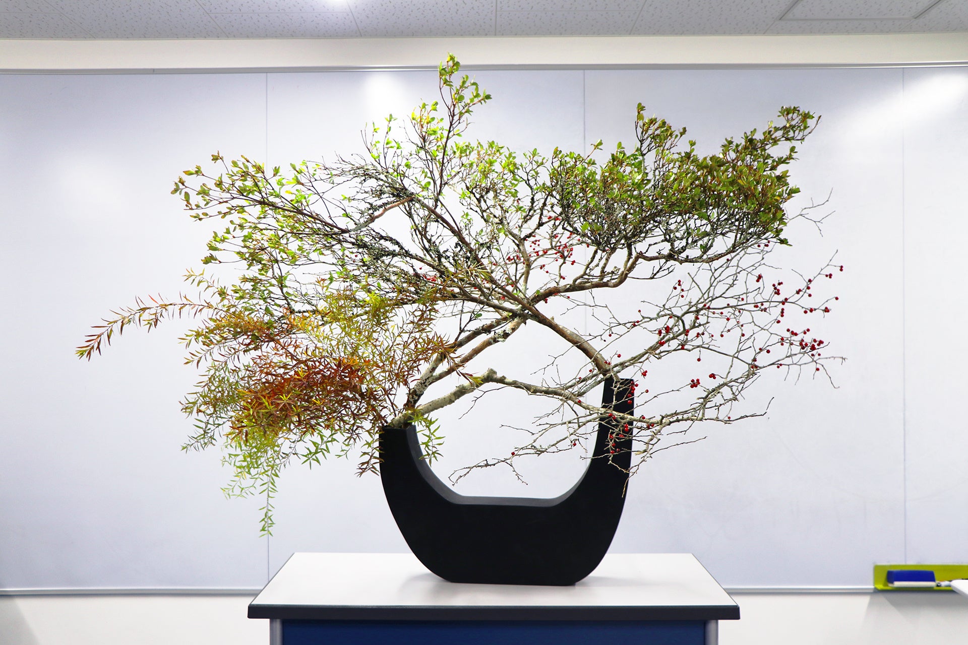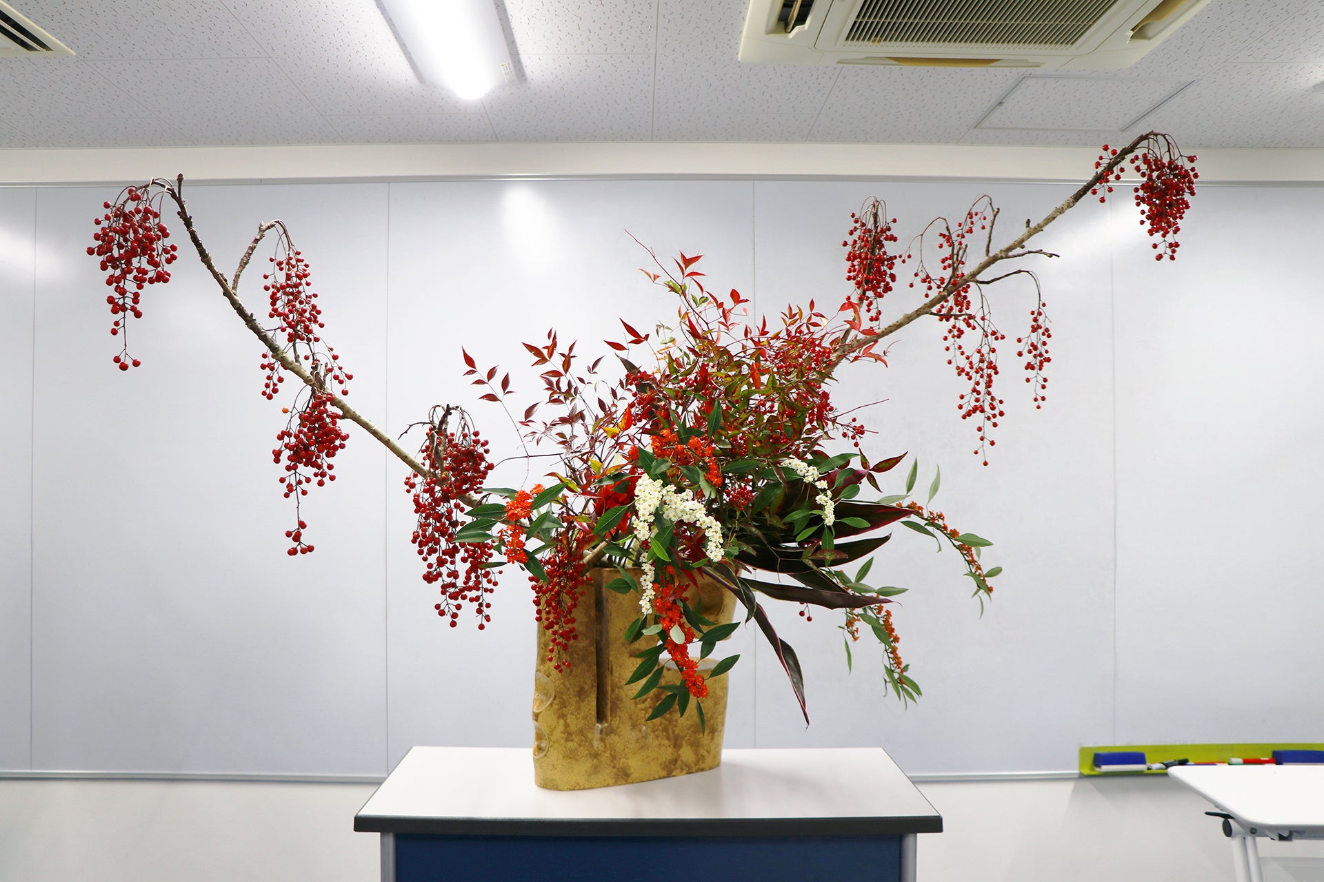 基礎を身につけた上で行ういけばなの創作は、無数の選択の積み重ねでもあります。どの枝を残し、どの位置にどの植物を入れるのか。色合いや花器の形、さらには、どの空間に、どのような人が見るのかといった視点も欠かせません。