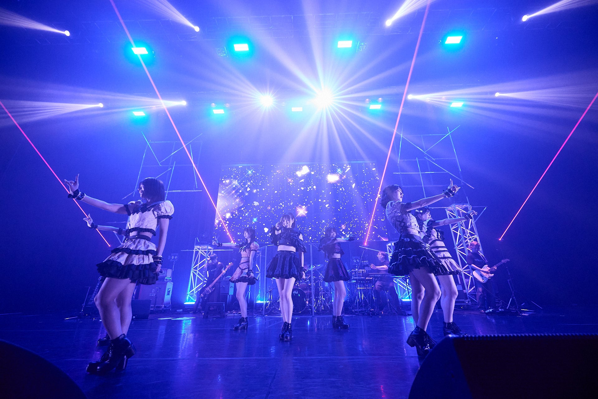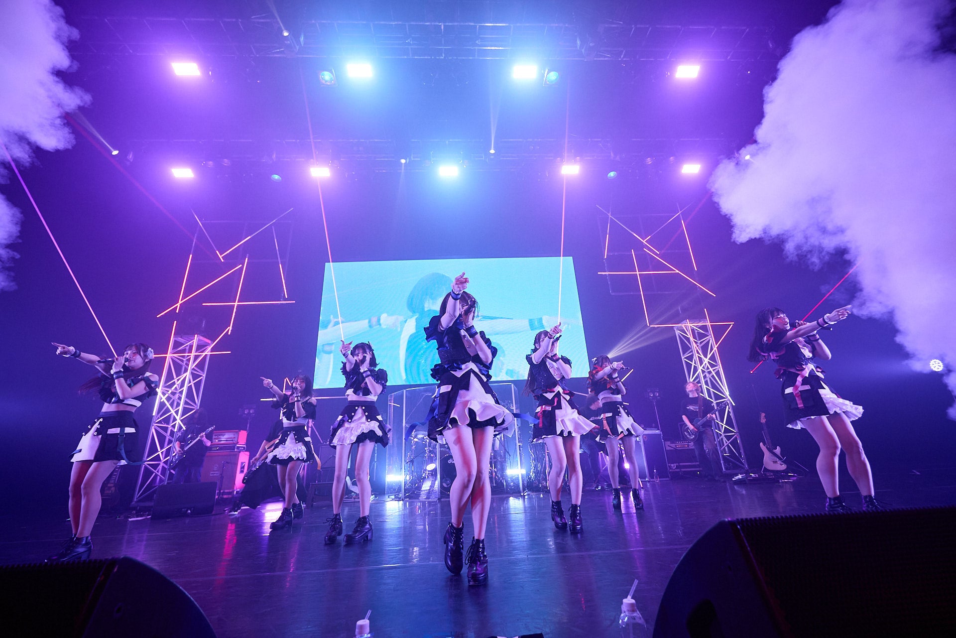 その後、続けざまに披露された「絶対絶命LOVE」。ギターとドラムの激しいリズムに乗って、観客を煽りながら、「豊洲PIT、まだまだ足りないんじゃない!?」と叫ぶ。観客はその掛け声に応え、腕をあげる。CO₂が爆発的に吹き上がり、視覚的にも圧倒される中、メンバーはますます勢いを増し、激しいダンスで会場の温度をさらに上げていく。
