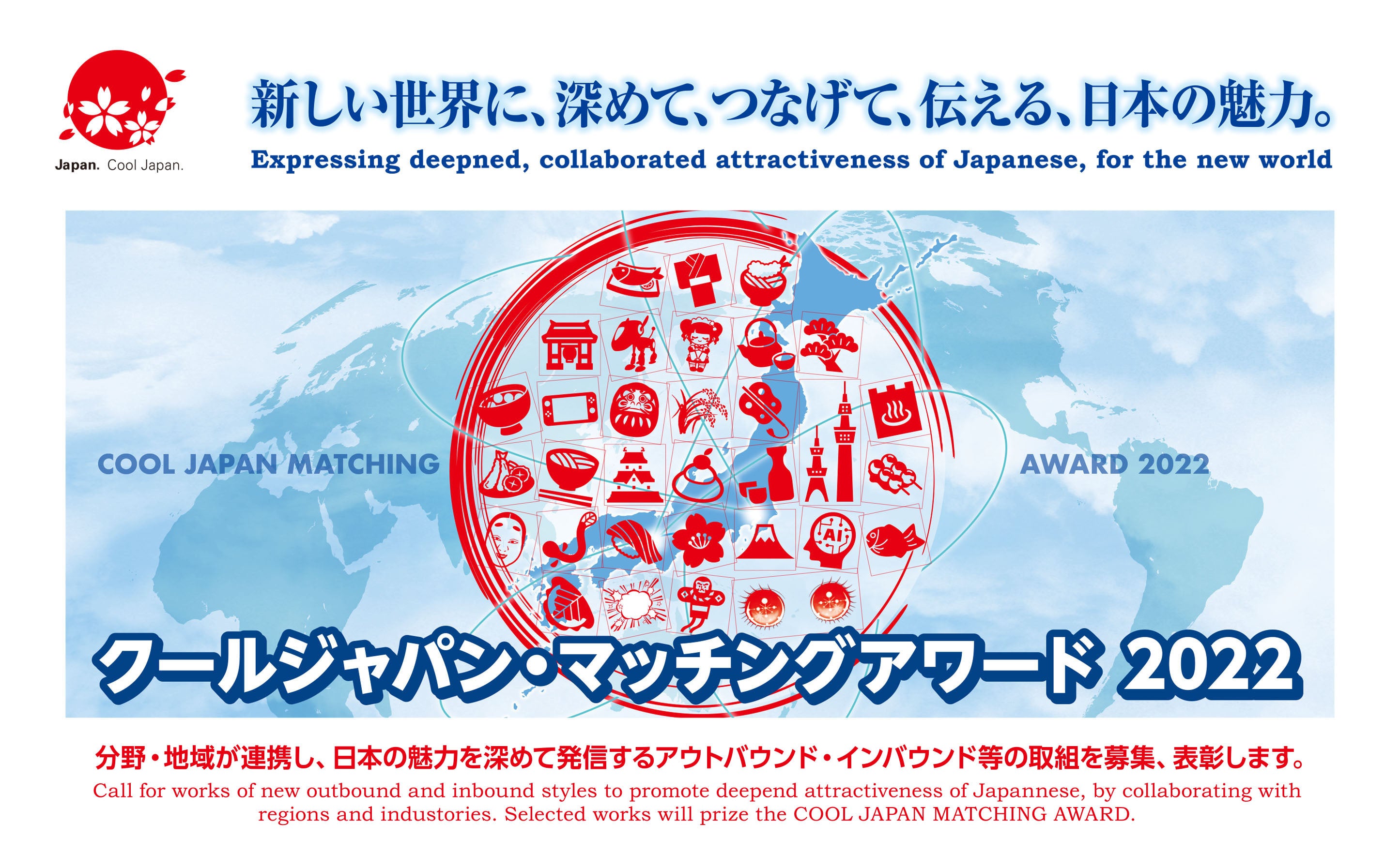 「クールジャパン官民連携プラットフォーム(内閣府知的財産戦略推進事務局)」主催による「クールジャパン・マッチングアワード2022」では、新しいスタイルが広がる世界に向けて、分野・地域が連携し、日本の魅力を深めて発信するアウトバウンド・インバウンド等の取組を、令和4年2月15日(火)~3月8日(火)にてアワード候補として募集します。